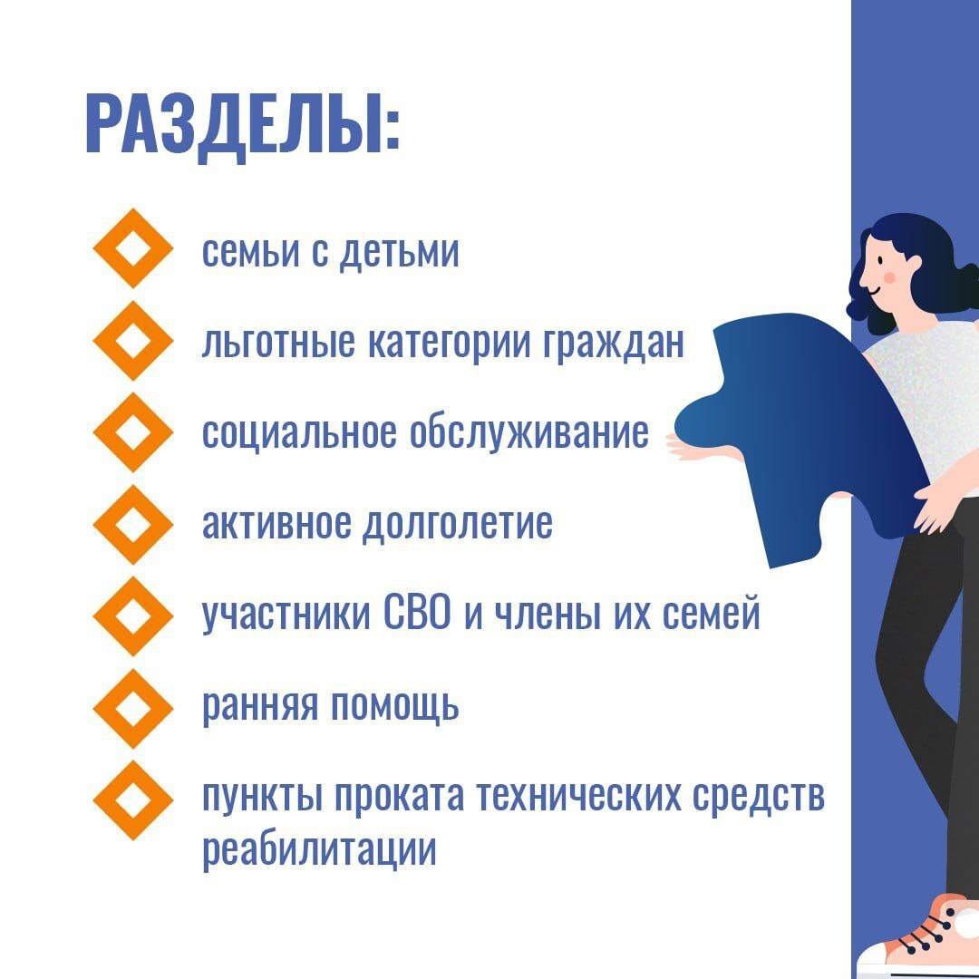 На платформе размещены разделы с информацией о мерах социальной поддержки для инвалидов, ветеранов труда и боевых действий, членов их семей, участников СВО, реабилитированных лиц и других категорий граждан. Навигатор содержит актуальные списки документов, контакты учреждений и прямые ссылки для подачи заявлений через порталы государственных услуг.